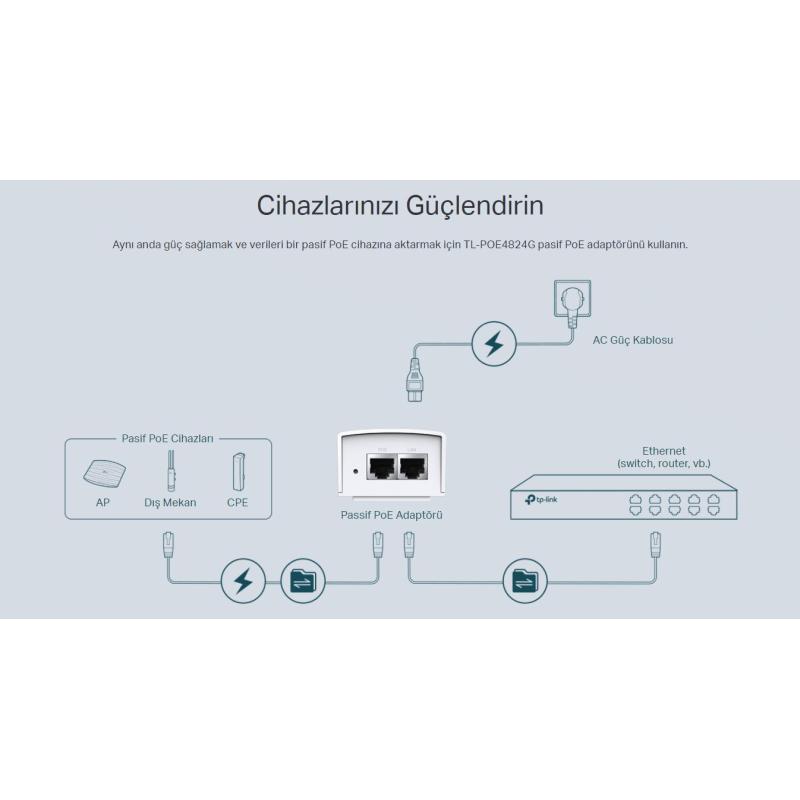 TP-LINK TL-POE4824G 2 PORT 10/100/1000 48V 24W PASIF POE ADAPTOR RUIJIE UYUMLU 12v satandart girişli cihazlarla uyumlu