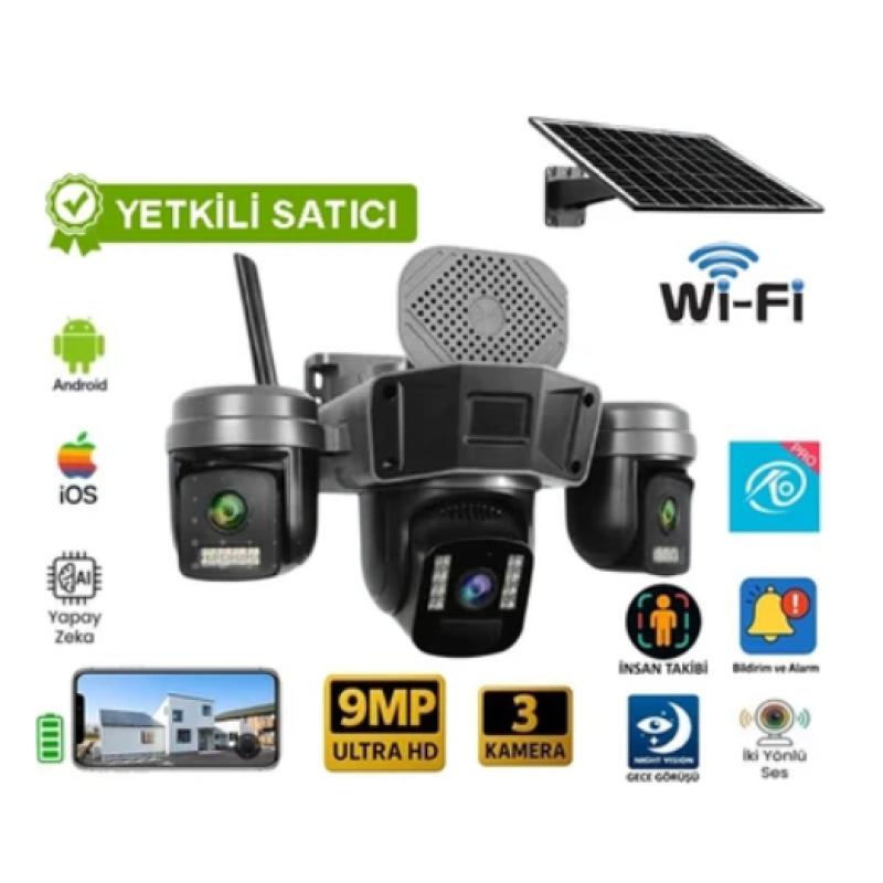 O-KAM-5210 WİFİ SOLAR 3 LENS SİRENLİ 3MP X3 9MP Wi-Fi kamera LED PANEL WİFİ